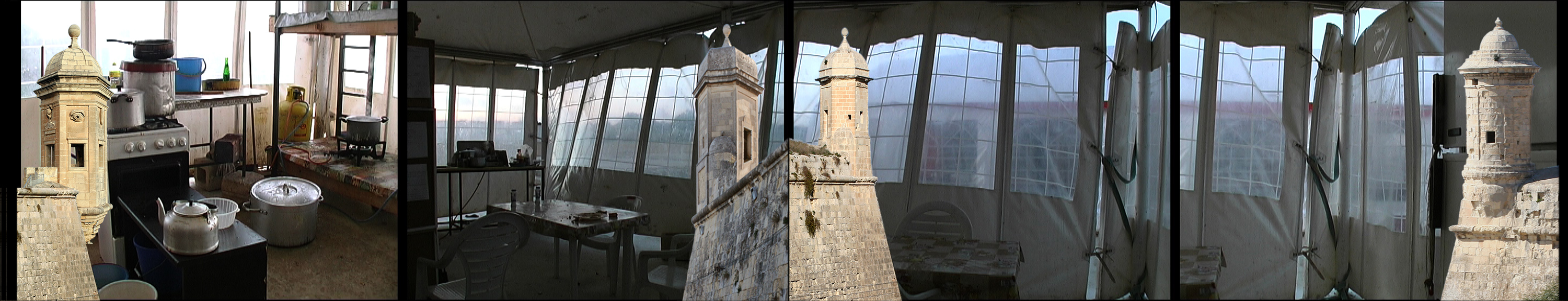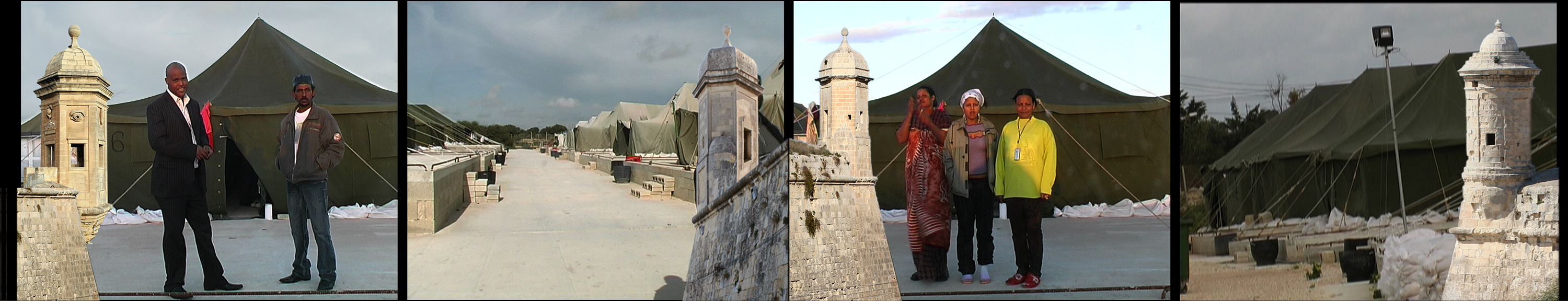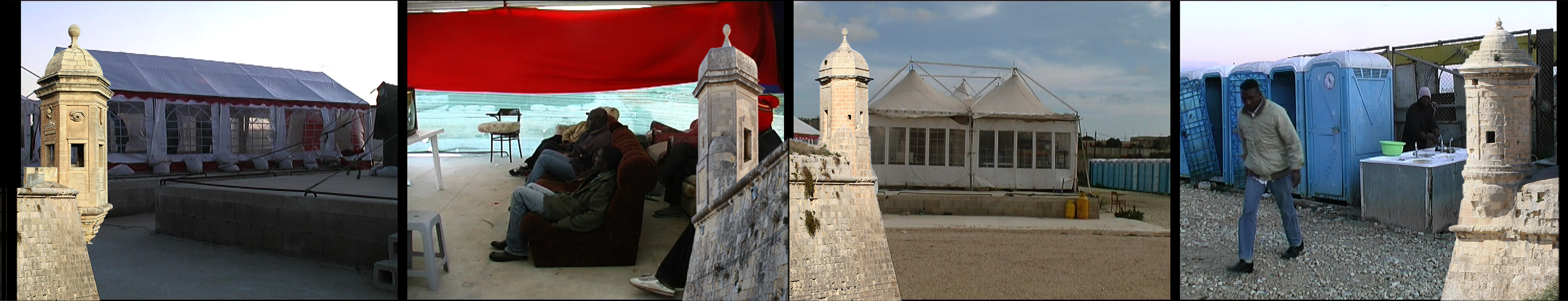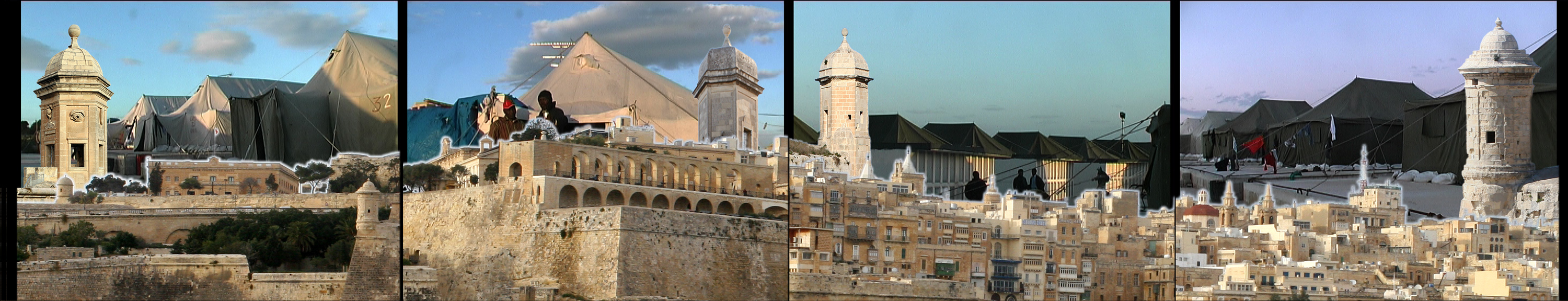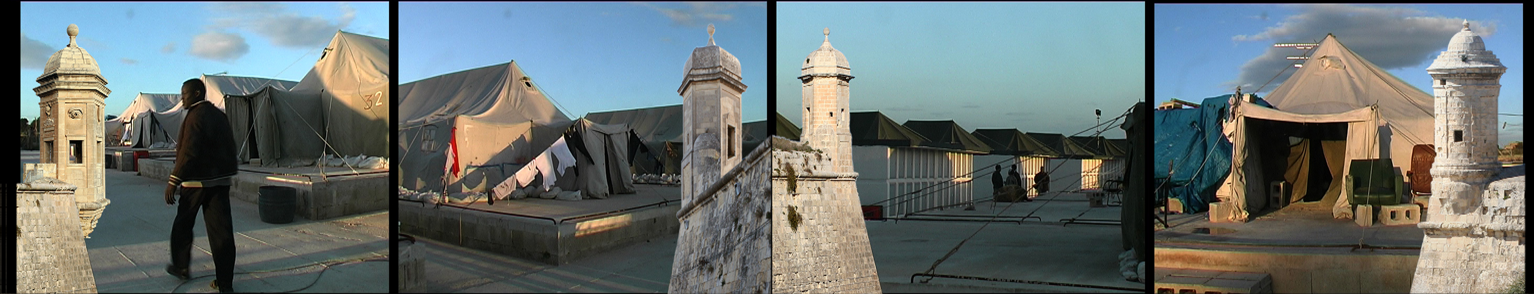In solchen "Open Refugee Centres" (mal Zelte, mal Häuser) leben viele afrikanische Flüchtlinge, nachdem sie bis zu einem Jahr in Abschiebehaft gehalten wurden. Sie dürfen Malta nicht Richtung Europa verlassen, finden aber auf Malta selten Arbeit. Am Ende der Szene steigt die befestigte Küste von Valletta vor dem "tent village" hoch.
